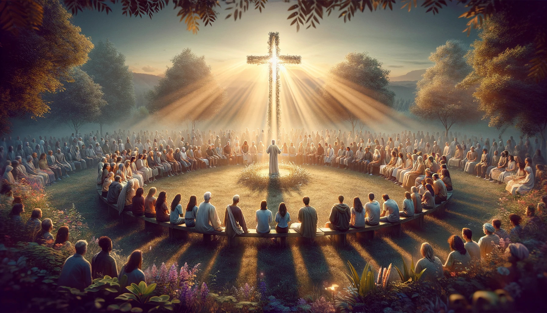 这幅图根据腓利门书第一章的灵感,生动地展现了在基督里的兄弟情谊和团结的本质。它描绘了一个信仰社区成员围成一圈的场景,体现了团结和平等,中心是代表基督存在和爱的符号,将他们紧密相连。场景设定在一个宁静的户外环境中,自然之美强调了和解和新开始的主题。整个氛围温暖而又欢迎,光线照亮了社区成员的面庞,突显了他们虽背景不同却心灵相通的统一精神。这一场景传达了强烈的和平、爱和相互尊重感,反映了宽恕的变革力量和基督徒作为兄弟姐妹生活的呼召。