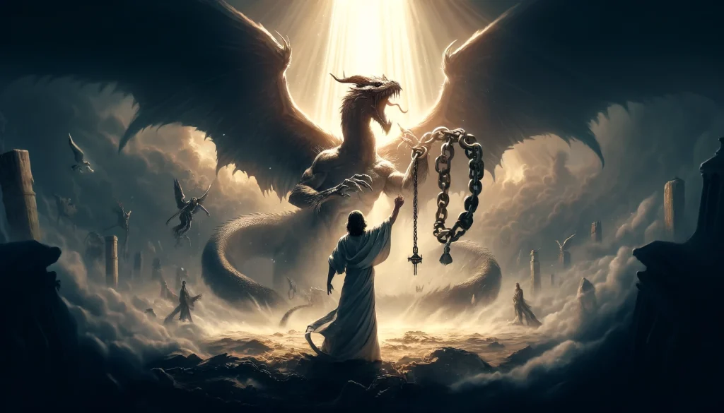 这幅图片灵感来自《启示录》第二十章,描绘了一个天使从天而降,手持深渊的钥匙和一条大链子,捉住并捆绑撒旦(以龙的形象呈现)的场景。背景是黑暗和不祥的天空,象征这一事件的严肃和重大性质。整个氛围传达了一种胜利和宽慰的感觉,因为邪恶的源头被暂时制服,阻止了其欺骗列国的行为。图中包含了链子、深渊以及强大的天使形象,强调这一圣经预言中的超自然和关键时刻。