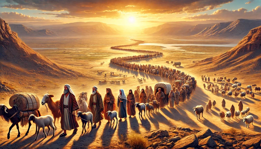这幅图片的创作灵感来源于《创世纪》第四十六章,描述了雅各和他的家族迁移到埃及的旅程。画面展示了一个长长的队伍,由雅各这位带着平和表情的老人带领,他们穿越广阔的沙漠,朝向地平线前行,背景逐渐过渡到埃及的肥沃土地。队伍中包括了各种家庭成员、羊群和牛群。落日的金色光辉照耀着整个场景,象征着希望和新的开始,随着雅各的家族在神的指引下开启他们生活的新篇章。